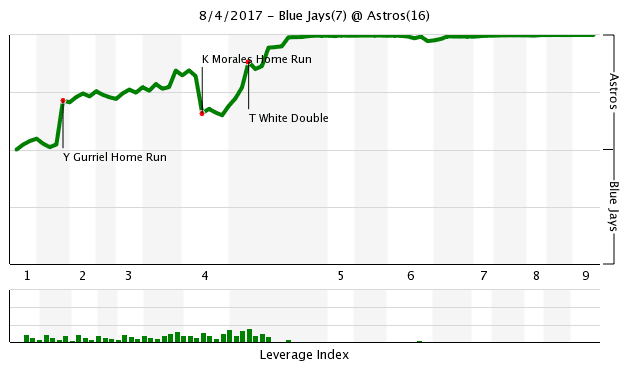 There weren’t too many opportunities for the Jays bats to have an impact with the poor pitching performance, but Kendrys Morales was responsible for the biggest impact. His home run with Justin Smoak on in the top of the fourth brought the Blue Jays within one run of Houston and increased the Jays odds of a win by 16.3%.