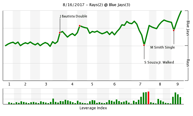 Just as the Jays had both their high leverage and high impact at bats in the third, the Rays had both of theirs in the seventh. The highest impact at bat would end up technically not being an at bat at all. With the bases loaded and only one away at the time, Steven Souza Jr. worked bases loaded walk, that would score Mallex Smith and bring the Rays to within one. Souza’s plate appearance added 14.4% to the Rays chance at a win.