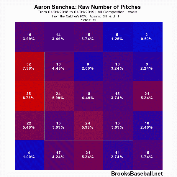 Using FanGraphs weighted pitch values metric, which measures how many runs above or below average each pitch type in a given pitcher’s repertoire has been, his changeup has fared quite well. Sitting at 1.25 runs above average per 100 pitches (wCH/C), this is better than his curveball was in 2016 (0.68). The most noticeable drop is in his hard pitches (fastball/sinker mix). During his breakout 2016 campaign, his wFB/C sat at a solid 0.95, however this year it’s fallen to -0.67. Looking at isolated power against, you see a noticeable uptick, especially with his sinker, which Brooks Baseball has recorded Sanchez throwing 42.3% of the time. In 2016, opposing hitters had an ISO of .124 against the sinker, however this year it’s jumped to .228.