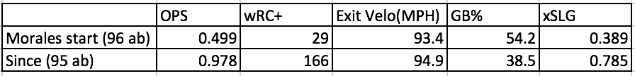 I always do this when I talk about a sample size, so I’ll just include a disclaimer here: I’m not a hitting coach, nor have I talked to him about this, but something really turned around for Morales in the middle of May, and he began seeing results around the 19th.