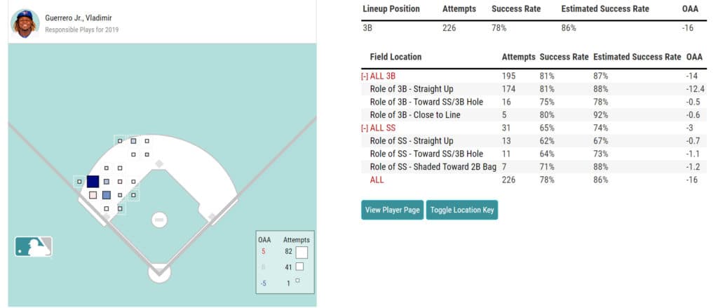 Not only did Guerrero struggle at the plate this past season, he also had difficulty fielding his position at third base. Conventional defensive metrics uncovered his issues at third base, and this new Outs Above Average metric and Defensive Runs Saved painted a similar picture for Vladdy at the hot corner in 2019.