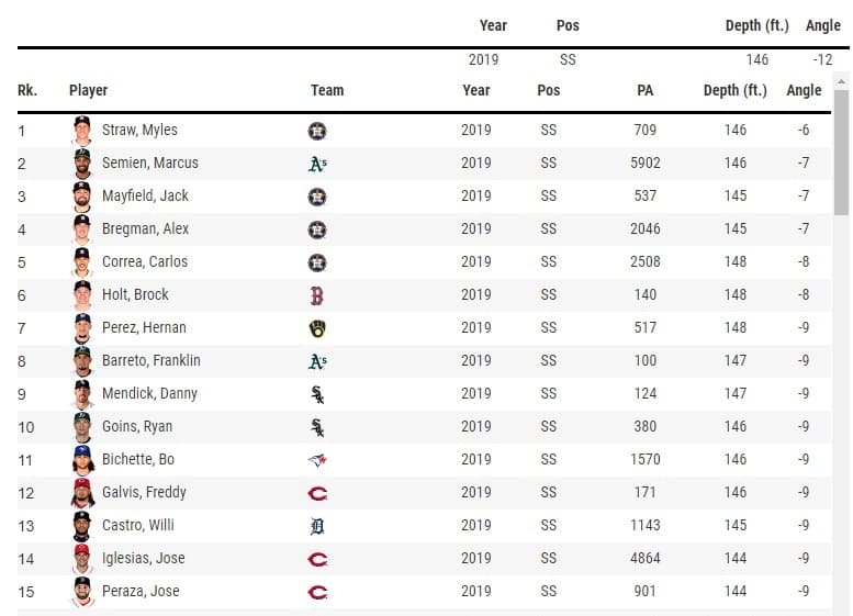 What follows is a leaderboard, courtesy of Baseball Savant, of the average start position of shortstops last season, sorted by angle.