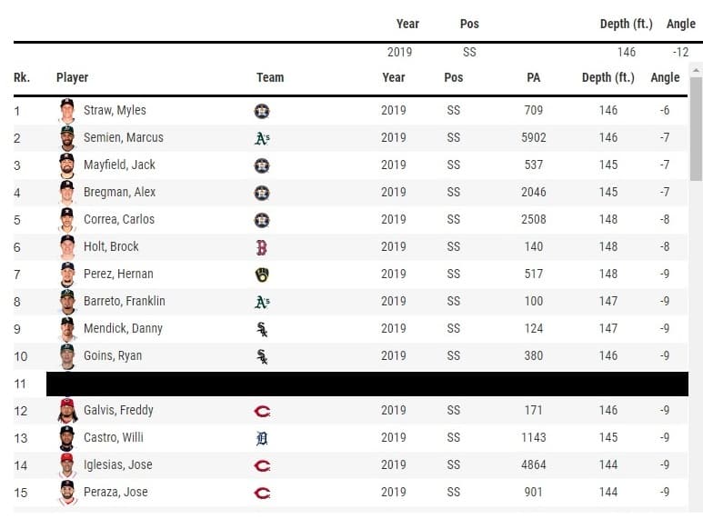 The angle is based on home plate, whereas the third base line is -45°, up the middle is 0°, and the first base line is 45°. For a shortstop the lower their angle is the closer they are to second base. This leaderboard is showing the 15 shortstops that started the closest to second base last season. The 11th ranked player is blacked out for now, I am quite certain you know who that is given the title of this post, but we will get to that later.