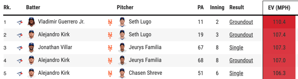- Robbie Ray got the start tonight in what should have been Hyun Jin Ryu’s turn in the rotation, but the team opted to give the ace an extra day of rest. Ray gave the Blue Jays everything they could have asked for, holding the Mets to just one run over five innings of work. This was a much different Ray than we’ve seen so far, as he was hitting as high as 97 miles-per-hour on his heater. That’s a pretty significant rise from where he usually sits. Ray was also pounding the strike zone a lot more than he generally has been this season, as he walked just two batters over his five innings. Really encouraging stuff.