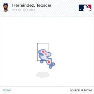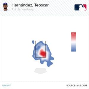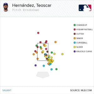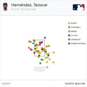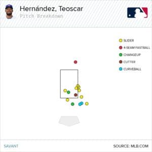 Pitchers have identified a weakness and are attacking it. Per Baseball Savant, no hitter has seen more sliders than the 49 Teoscar has seen. No hitter has seen a higher percentage of sliders than the 39.2% Teoscar has seen and that is a full 5% higher than anyone else in the league. Eight of his 14 strikeouts have come via the slider and they have predominantly been down and away.
