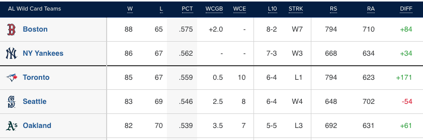 The Blue Jays have a game in hand against New York and they’re tied in the loss column at 67, so, if Toronto wins on Thursday night in Minnesota, they’ll be tied again going into Friday. Also, the Yankees and Red Sox are playing each other this weekend, so it guarantees that one of these two teams is going to drop two games over the weekend.