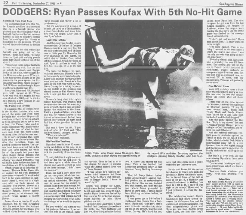 The Dodgers would find themselves in a no-hitter and eventual World Series win of their own, as on September 26 against the Houston Astros, they would fall to none other than the legendary Nolan Ryan. It was Ryan’s fifth of an MLB record seven, and he struck out 11 batters while walking three.