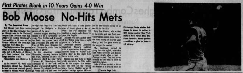 Another New York team would be next to be no-hit and win the World Series, as the Mets dropped a 4-0 decision to the Pittsburgh Pirates on September 20th. For the Pirates, it came amid a career year for Bob Moose, whose .824 W-L% was a career-high, and on that day, he threw a full nine innings, striking out six while allowing three walks.