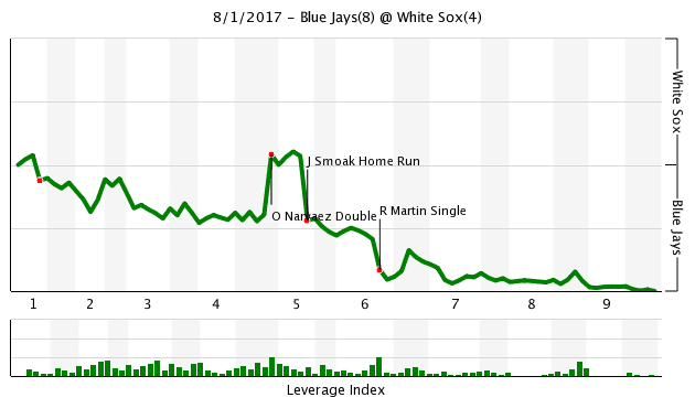 The White Sox hitters were the same as the Jays tonight, not running into any extremely high leverage situations. The highest LI they would see was 2.09. Omar Narvaez came to the plate in the bottom of the fourth with two men on and the Jays currently leading by two. The results could land anywhere from a game leading home run to the Jays escape without any further damage. Last night, the highest leverage play for the White Sox would also be their highest impact.