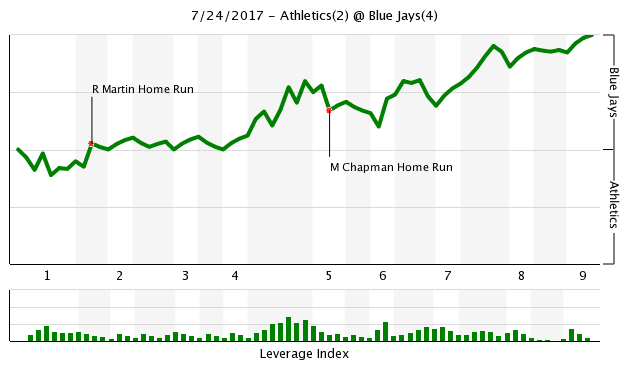 The highest leverage at bat for the Jays came in the fourth inning against A’s starter Chris Smith. Smith juiced up the bases with only one away, and the game currently tied at one a piece. Ezequiel Carrera was the man to come to the plate with the opportunity to take a big lead, or alternatively the way things have been going hit into a double play to end the inning. The high-pressure situation was represented by a leverage index of 2.89, and Zeke didn’t let the team down. A single scored Josh Donaldson, put the Jays ahead, and handed the baton off to the next guy.