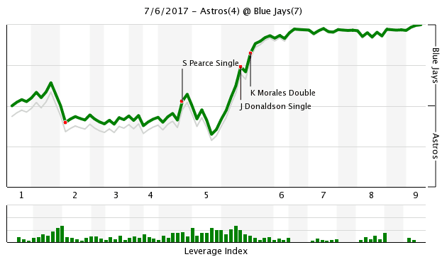Believe it or not, the highest leverage at bat didn’t come in the big fifth inning, it would actually occur in the first.The Jays set themselves up with an excellent opportunity to get ahead early in this one, loading the bases with only one away. With Kendrys Morales striking out for the second out, the runners stayed put for Troy Tulowitzki. A big swing on the line where an out to end the inning could bail McCullers out of a jam, or a base hit could lead to an early lead for the Jays, the LI came in at 2.77. Unfortunately for the Jays, Tulowitzki followed suit and struck out to end the inning.
