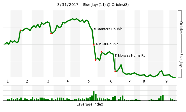 The Orioles started to mount themselves a bit of a comeback in the 8th, and as a result, would see their highest leverage at bat arise there. With Tepera struggling to shut the door, Osuna was called in to navigate his way to a four out save. Osuna would face Adam Jones, and following a passed ball, would do so with runners on second and third. Down by three and representing the tieing run, Jones faced a leverage index of 2.23. Jones fell flat on his face, grounding out to second to end the inning.
