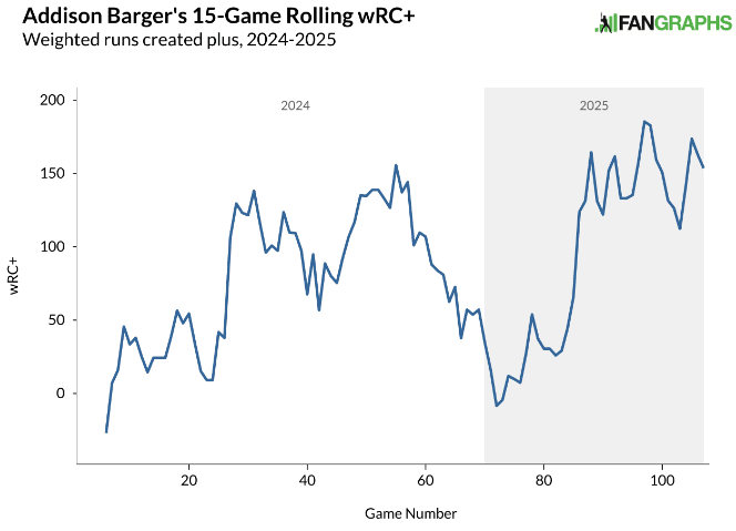 And as you can gather from Barger’s 15-game rolling wRC+ chart since his debut 2024 season, this recent stretch has easily been the best of his young big-league career.