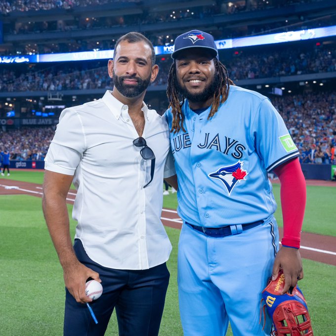 His ceremony concluded with him throwing out the first pitch to Vladimir Guerrero Jr. Instead of Vladdy signing the ball and giving it to José, he reversed the process and wanted a signed ball from Bautista. Shortly after, Cubs starting pitcher Marcus Stroman, a former teammate a Bautista’s, ran out of the Cubs dugout to give him a hug before the game started.