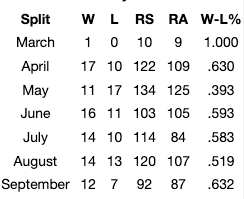 Besides, if there’s one defining trait of their season, it’s been their maddening consistency according to Baseball Reference’s month-over-month win-loss split, Aside from May, the Jays have produced a winning record every single month. To fans’ eyes, they have been nothing but inconsistent, but their persistence has defied that eye test with the team’s virtually bulletproof pitching and defence leading the way.