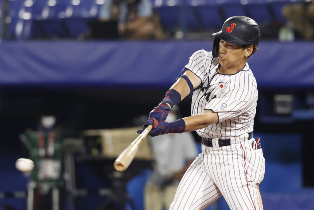 Aug 4, 2021; Yokohama, Japan; Team Japan outfielder Masataka Yoshida (34) hits a single against Korea in a baseball semifinal match during the Tokyo 2020 Olympic Summer Games at Yokohama Baseball Stadium. Mandatory Credit: Yukihito Taguchi-USA TODAY Sports