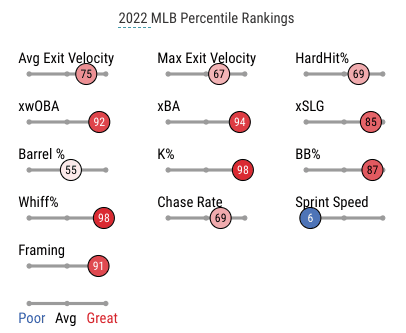 Thanks to his stellar bat-to-ball skills, there are only a handful of other hitters who’ve recorded a higher xAVG, xSLG and xwOBA than Kirk in ’22. Not to mention, his strikeout and whiff rates sit just two percentile points lower from placing in the highest group of the majors.