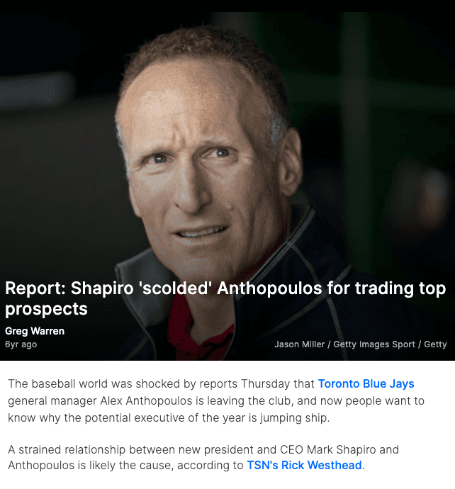 There was also a report that Shapiro had “scolded” Anthopoulos for trading away so many top prospects, even though it directly led to the best run the team had seen in decades and AA was named Executive of the Year by The Sporting News.