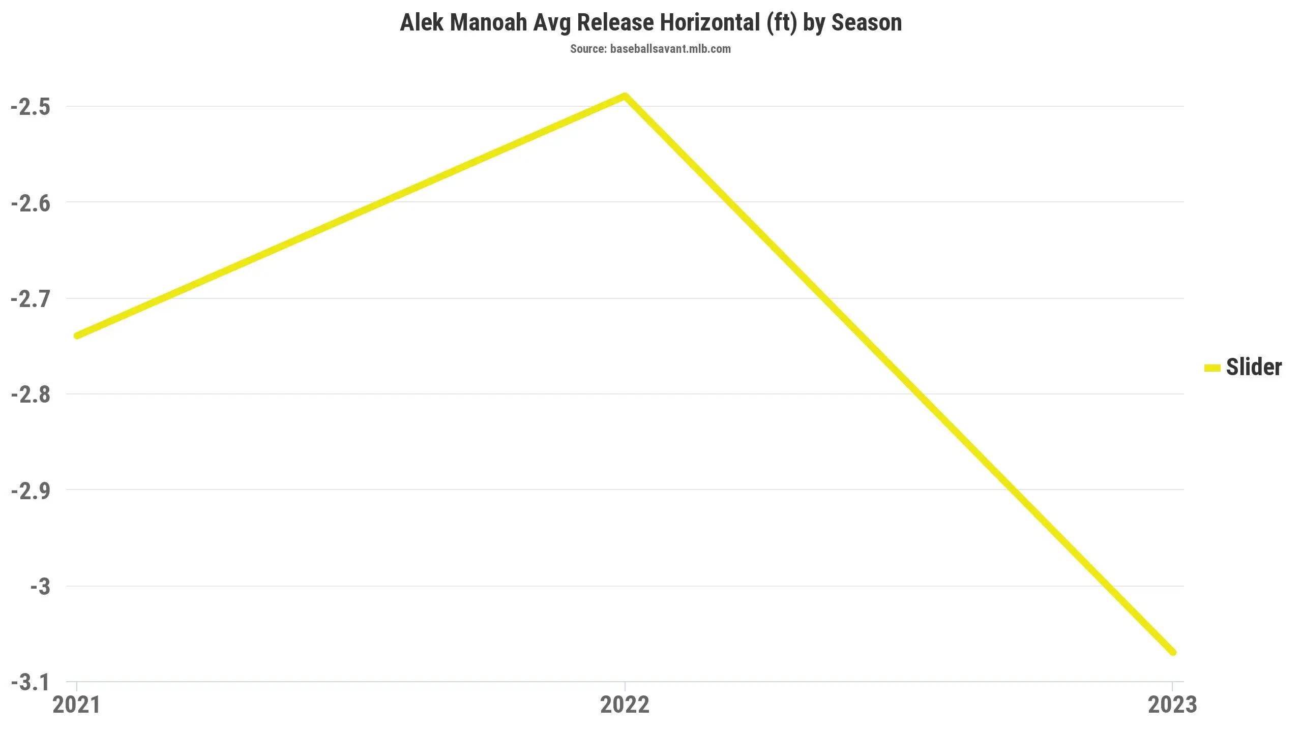 For any pitcher, finding a comfortable rhythm is vital. Once discovered, you must consistently repeat your delivery – an aspect Manoah has been battling in 2023. With his slider, in particular, he has been releasing further away from his body, increasing his average horizontal release point to 3.07 feet.