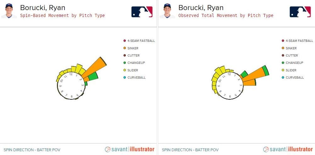 Much like Ryu’s cutter Borucki’s slider doesn’t have a lot of movement when compared to similar sliders. The deviation Borucki gets on his slider is substantial.