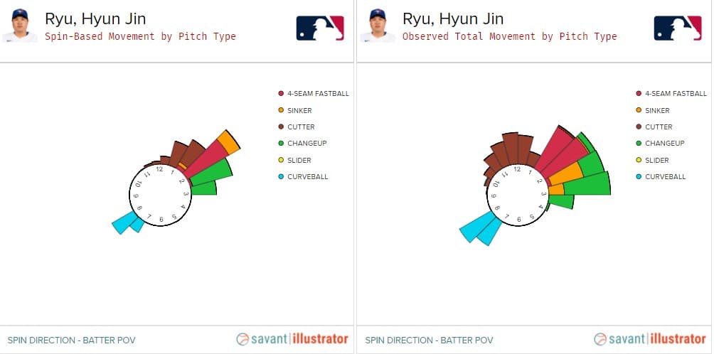 On the left we have the spin-based movement by pitch type, which is the spin of the ball coming out of the pitchers hand. It’s set up to look like a clock, so the spin of Ryu’s cutter in brown when he releases the ball spins between 12:00 and 1:30. It has some overlap with his fastball, and mirrors the spin of his curve, which spins between 7:00 and 8:00. On the right we see the observed total movement by pitch type, which is the spin of the ball at the plate.