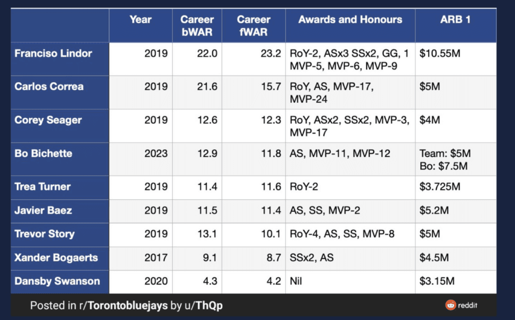 If the Blue Jays and Bichette actually wind up going to arbitration, which isn’t even a guarantee because these things often get settled in the week leading up to the hearing, the team’s case that he’s worth the number they presented isn’t just going to be them saying “Bo is hilariously streaky, he whiffs at every breaking ball thrown at him, and he airmails a bunch of throws to first,” it’ll be based largely on what other shortstops have recently been paid in their first year of being arbitration eligible.