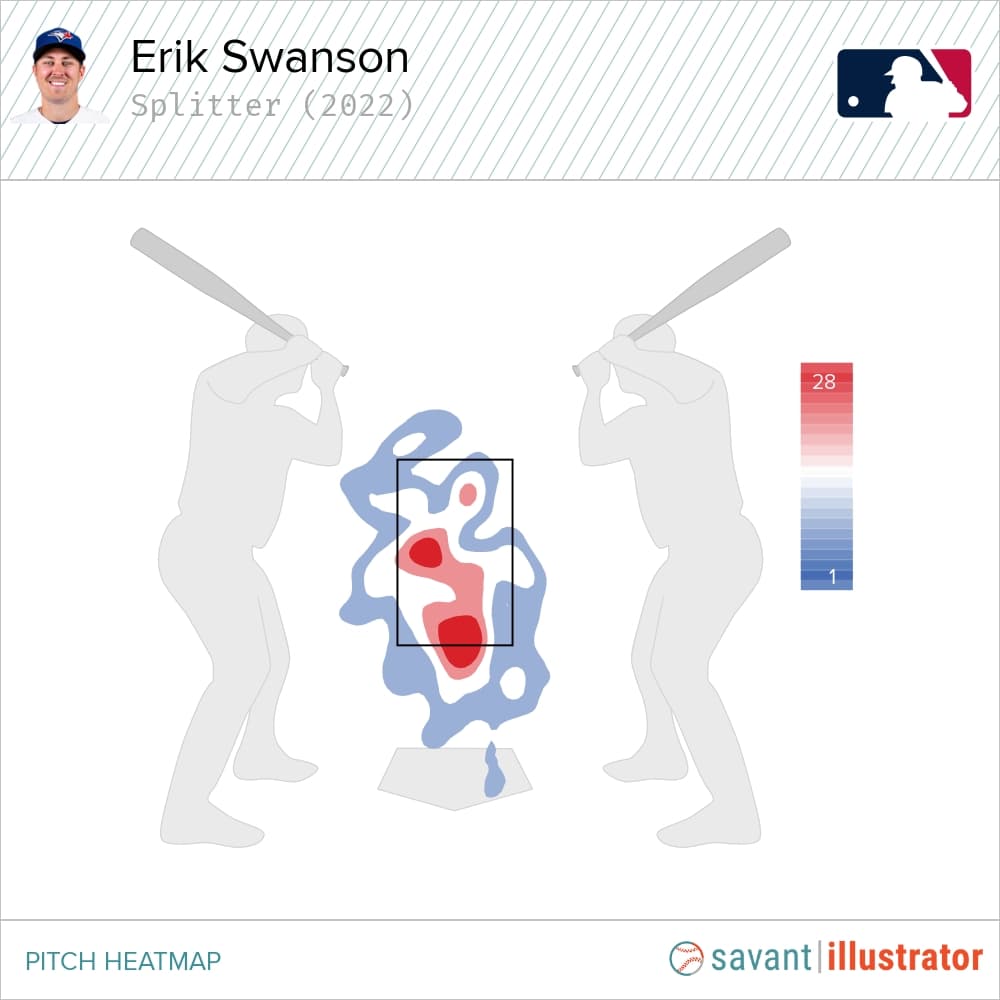 As reliable as Swanson’s fastball was in 2022, it wasn’t close to the best pitch in his arsenal. Instead, that honour fell to his mid-80s splitter, which produced the fifth-best run value (-5) and the seventh-lowest OPP AVG (.129) among fellow big-league splitters.