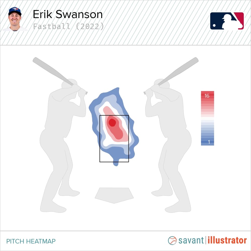 With an average spin rate of 2,291 RPMs, ranking in the 63rd percentile, Swanson’s fastball generates plenty of backspin and forces the opposition to think it’s rising when it’s not. Each pitch that any pitcher throws will decline upon release, but those capable of manipulating their heater can limit its vertical movements, which applies to the newest Blue Jays hurler.