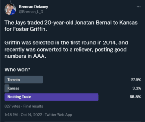 In the last toss-up I believe the Jays won, they traded 20-year-old prospect, Jonatan Bernal, for former first-rounder Foster Griffin.