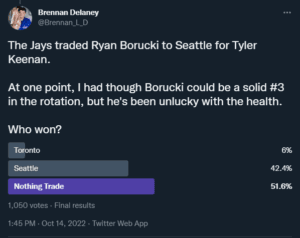 Sadly, 2021 wasn’t great for Borucki, owning a 4.94 ERA and 5.66 FIP in 23.2 innings pitched with a 21.4 K%. His time with the Jays in 2022 wasn’t much better, posting a 9.95 ERA and 7.53 FIP in 6.1 innings pitched, with a 24.2 K% and a 15.2 BB%. Ultimately, he was DFA’ed and traded to the Mariners for a prospect named Tyler Keenan.