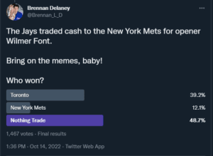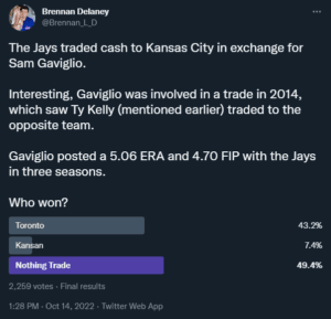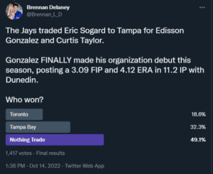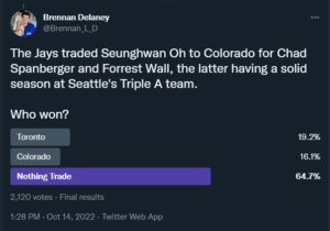 The Jays traded Lane Thomas, now a big leaguer, for other considerations. In the poll, 83.4% of 5,093 voters considered this a “nothing” trade, while 15.3% of votes considered this a win for St. Louis.