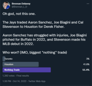 The biggest “it’s a nothing trade” out of any trades that the Shapiro/Atkins regime has made. The Jays traded Aaron Sanchez, Joe Biagini, and Cal Stevenson to the Astros for Derek Fishboi.