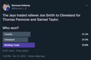 The Jays traded then 33-year-old Joe Smith to Cleveland for prospects Thomas Pannone and Samad Taylor. With the Jays, Smith posted a 3.28 ERA and 2.32 FIP in 35.2 innings pitched and had a 35.4 K%, well above his career average of 21.1%.