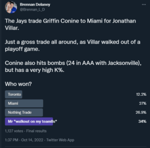 The Jays traded Griffin Conine for Jonathan Villar at the 2020 deadline. Villar sucked with the Jays, slashing .168/.278/.203 with no homers and a 27.8 K% in 79 plate appearances. He also walked out of a playoff game due to being pulled. Even though the Jays still had a game remaining. That’s gross.