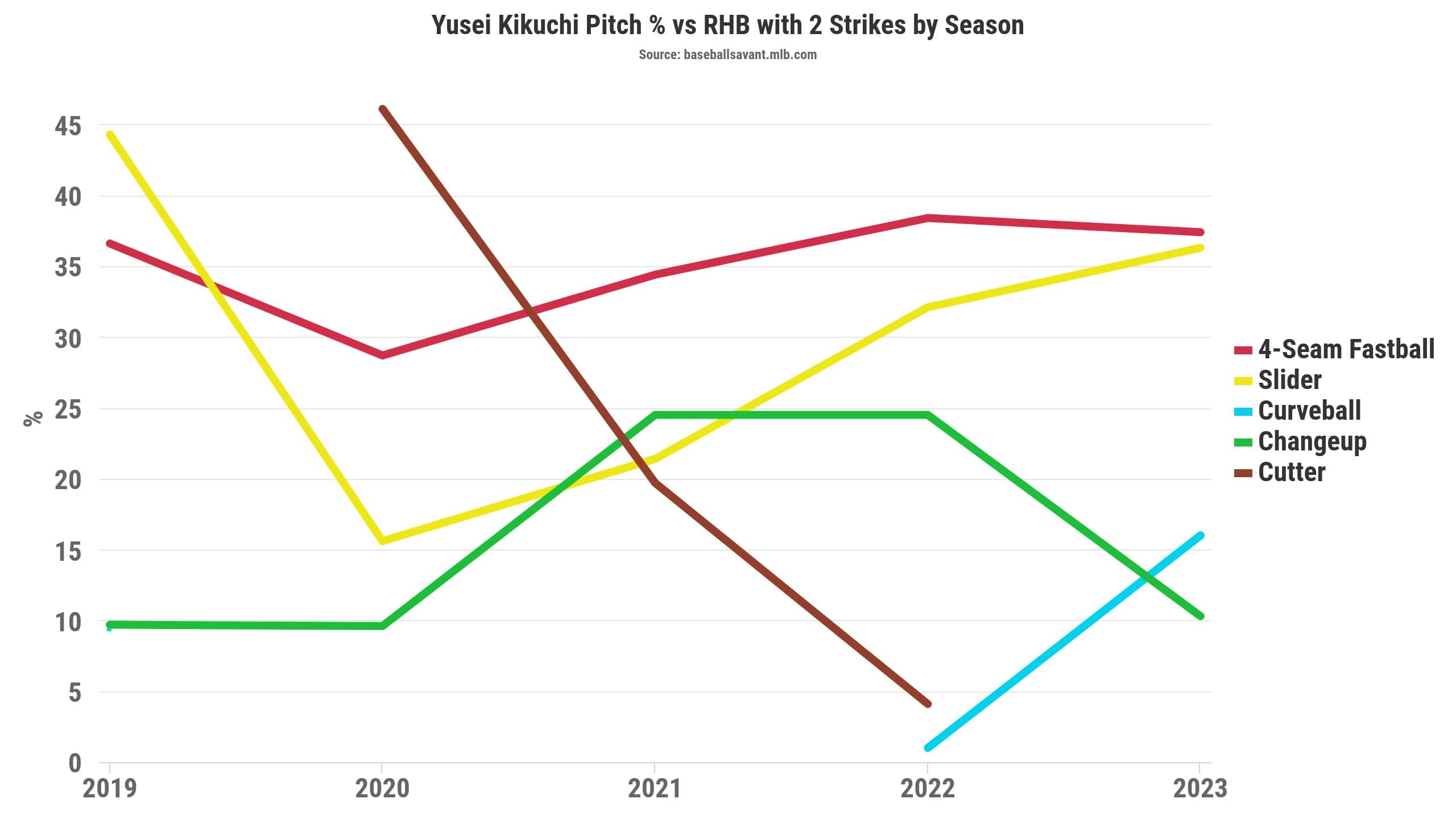 Knowing when to throw a pitch is often as important as where it finishes. For Kikuchi, that’ll mean increasing his changeup’s usage versus right-handers, particularly during two-strike counts, after he used it only 10.3 per cent of the time in 2023 – a dramatic decline from its deployment across 2021-22.