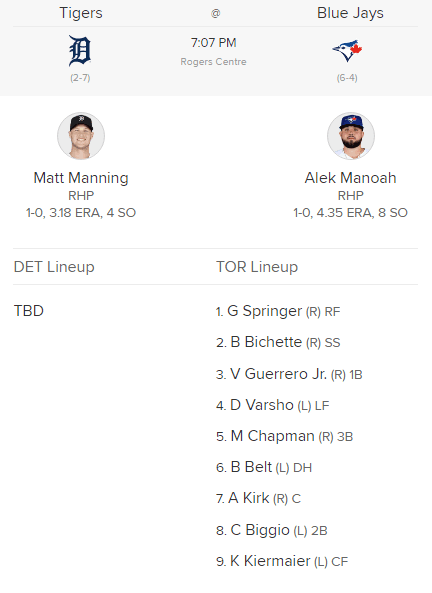 Tonight we’ll get a look at Alek Manoah on the mound for the Jays home opener. After struggling in the season opener against St. Louis, he went seven innings against the Kansas City Royals allowing just one hit while walking four batters and striking out another five.