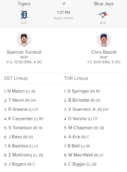 DET: Spencer Turnbull RHP — 0-2, 13.50 ERA, 2.25 WHIP, 4.5 K9, -0.5 bWAR.