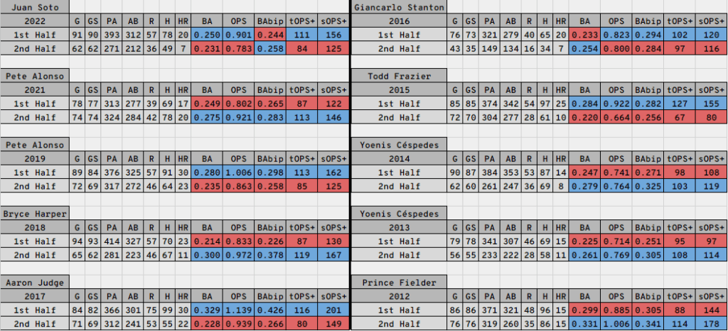 The long-standing trope around baseball is that there is a curse for the players who win the home run derbies, but based on these numbers alone, I’m not sold that it’s the case. In fact, it actually seems like a number of these players benefited from winning the derby. Look at Pete Alonso as recently as 2021, where his OPS jumped from .802 to .921 after the All-Star break, or Prince Fielder, who climbed from .885 to 1.006. Those are significant numbers.