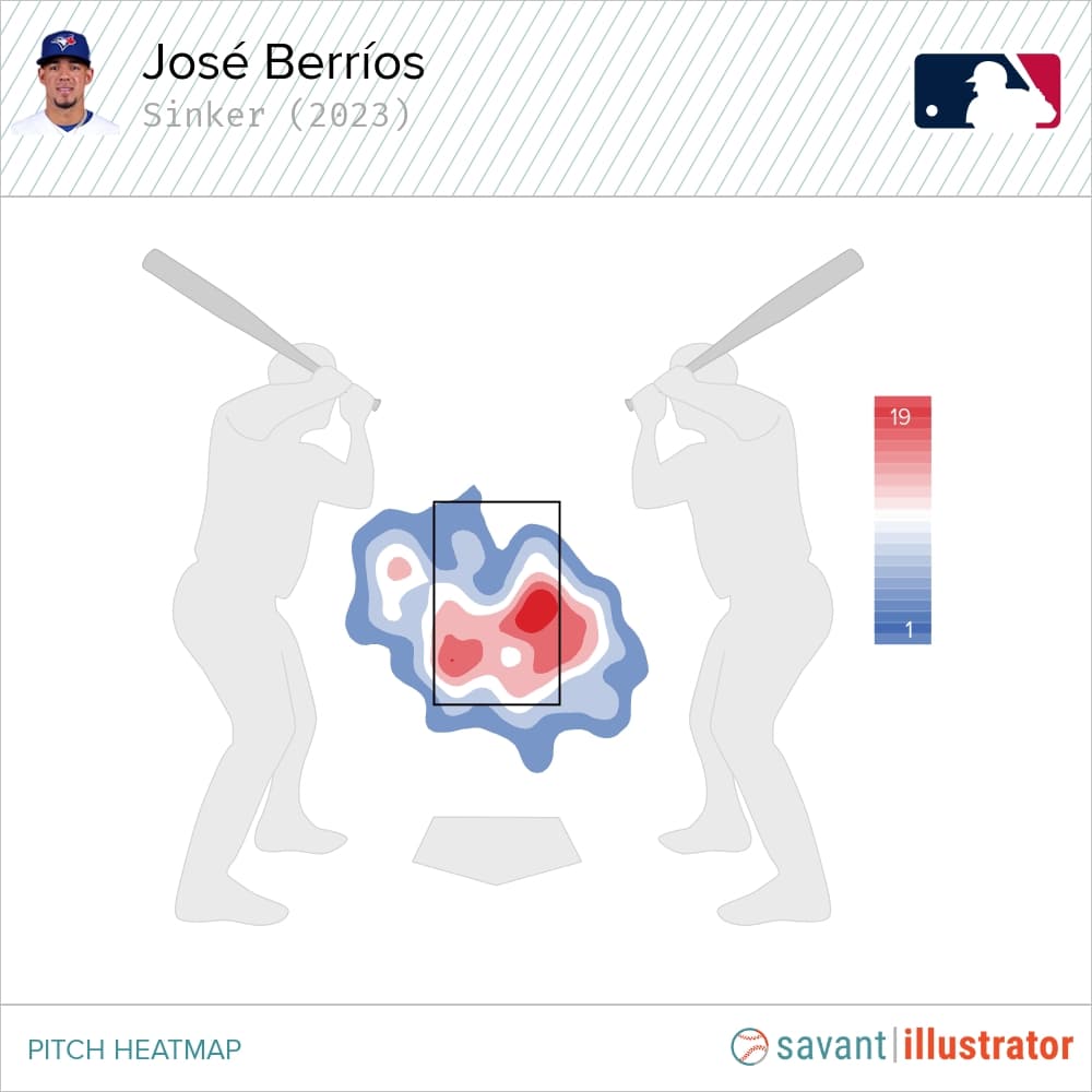 But as much as Berríos’ resurgence is tied to his changeup, he wouldn’t be performing at this level without the adjustments made to his two-seamer/sinker. While its mechanics and pitch properties have remained unchanged, it doesn’t feature the same attack zones from 2022, increasing his output of glove-side fastballs this season.