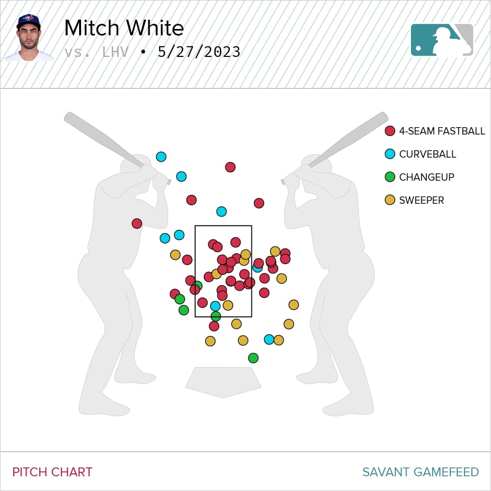 White leaned heavily on his four-seamer, throwing it over 50 per cent of the time, but it generated zero swinging strikes on 15 swings. Opposing hitters also created a 99.5 m.p.h. average exit velocity against it.