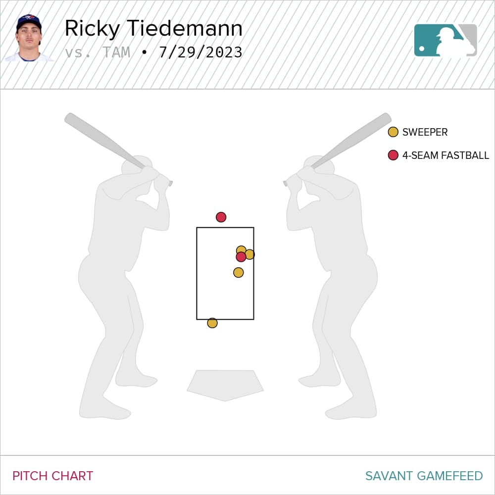 Tampa’s lineup had no answers against his sweeper, producing six whiffs on nine swings, including four punchouts. As a result, it created a sparkling 56 per cent called-strike-plus-whiff percentage on a 38 per cent usage.