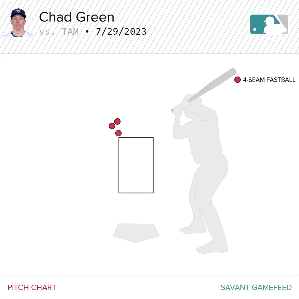 Of the 18 pitches (14 strikes) Green threw, 12 were four-seamers, inducing four whiffs on seven swings and a trio of strikeouts. Its velocity flashed similar readings to his first two rehab outings, averaging 94.1 m.p.h. and touching as hard as 94.9.