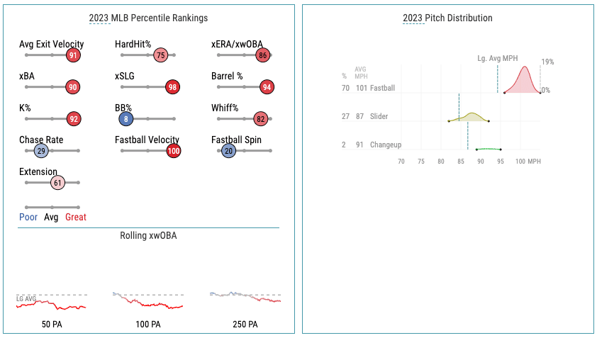 His fastball was the talk of the spring and was displayed on most highlight reels, touching up to 105mph. of five pitch options, his fastball is used 10.3% of the time averaging 99-101mph with a 36.1 WHIFF. His fastball has phenomenal bite, moving similar to a 2-seam with run, his fastball is well commanded, painting corners and working the shelves. He uses a changeup and slider as light pitch options and may show these in his early innings of work.
