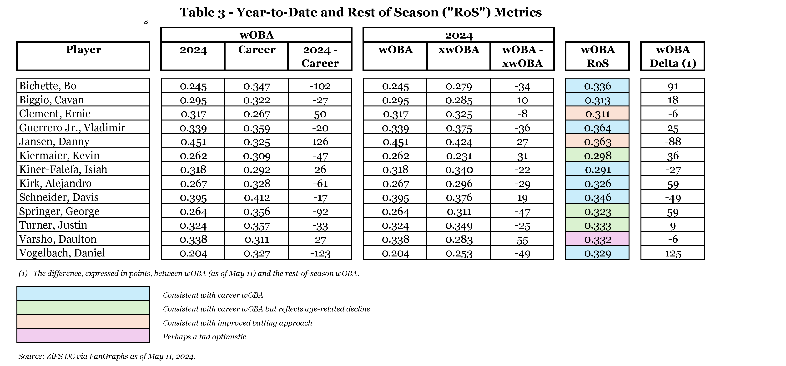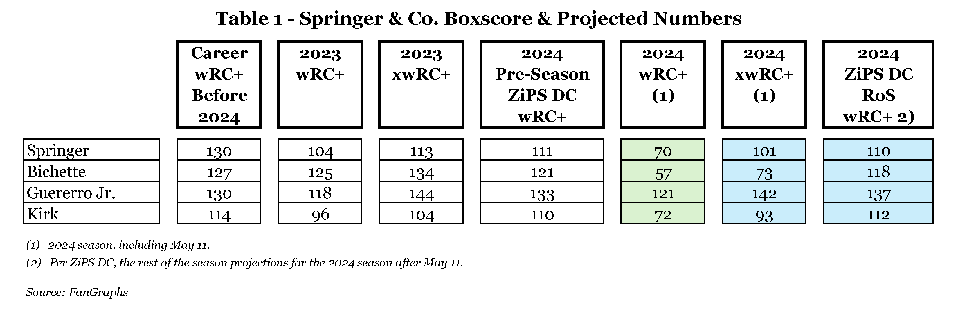 Before the 2024 season began, MLB observers typically identified three Blue Jays who needed to bounce back from disappointing 2023 campaigns: George Springer, Vlad Guerrero Jr., and Alejandro Kirk. Bo Bichette is another player who is essential to Toronto’s offence. For simplicity, let’s call these four players “Springer & Co.” Table 1 shows that all four have underperformed vis-à-vis 2023 boxscore numbers and 2024 pre-season estimates.