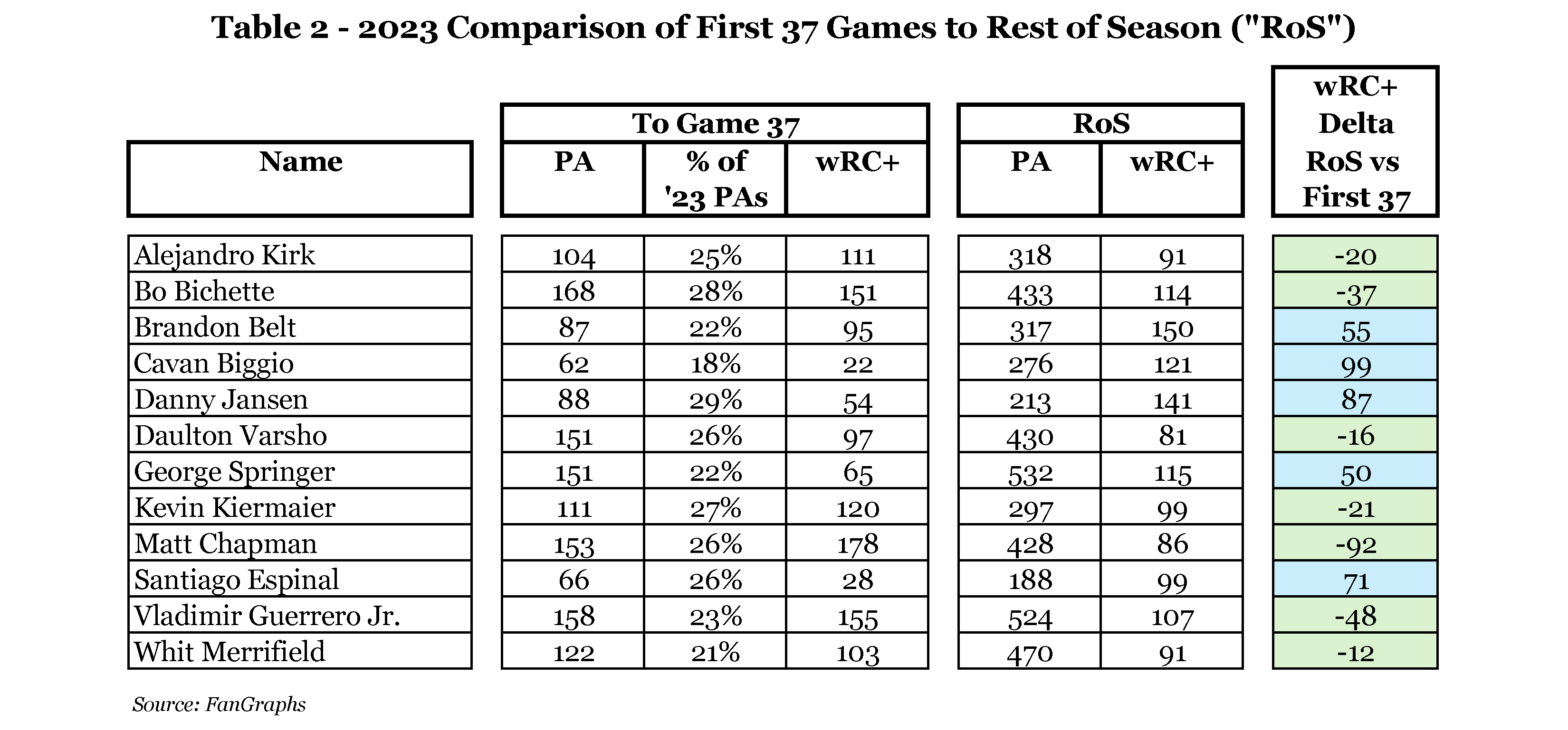 I started compiling the article’s data after Toronto’s May 8 game. At that point, the Blue Jays played 37 games in the 2024 campaign. I decided to examine how the 2023 campaign unfolded for Blue Jay players after Game 37. The reader will note the following:
