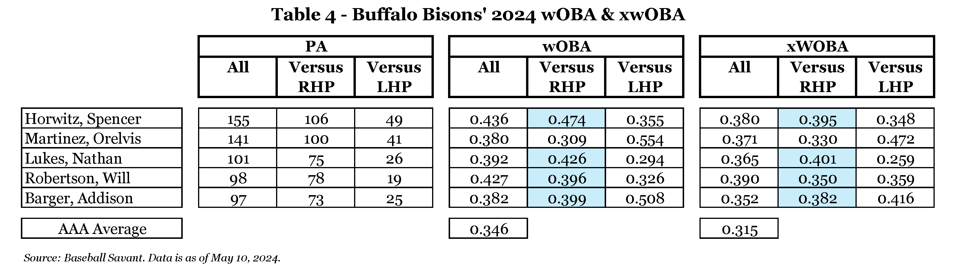 - As of May 12, 77% of Toronto’s plate appearances were against right-handed pitchers. Accordingly, the Buffalo call-up should excel versus righties.