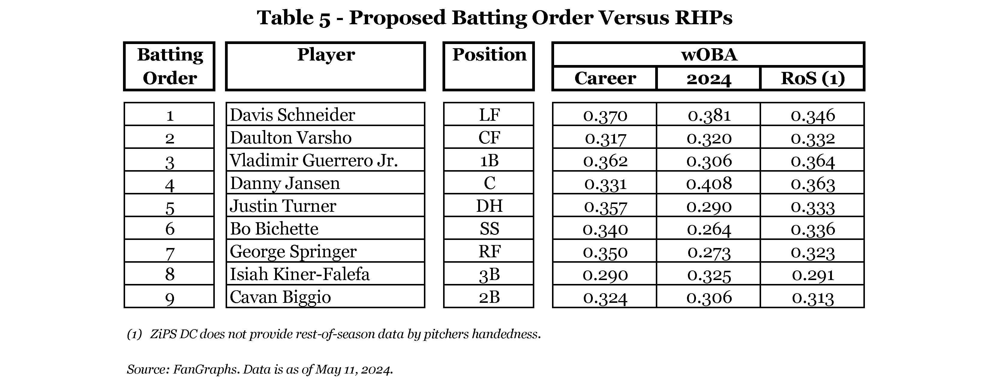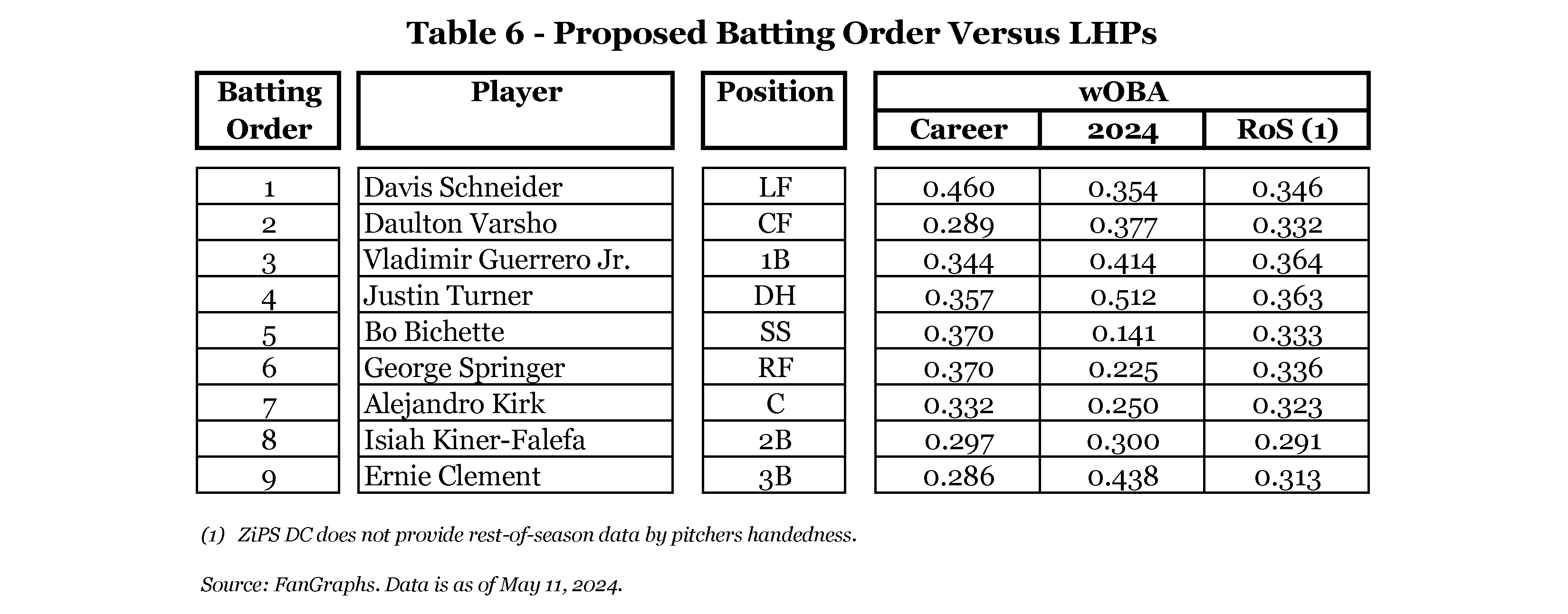 Yes, all models are wrong. However, from a batting perspective, based on ZiPS DC’s track record, I am optimistic about the balance of Toronto’s 2024 campaign. However, there are some changes that Management should make to the lineup in the interim.