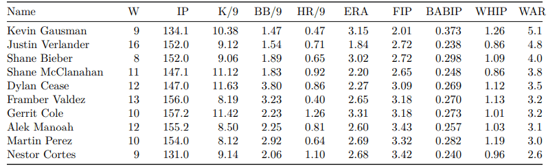 Table 1: AL Pitching Leaderboard as of August 30th, 2022 (Stats from FanGraphs)