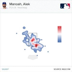 Manoah’s primary off-speed pitch is his slider, which he throws 26.6% of the time. The location of his slider has raised some concerns. It hasn’t hurt him yet; batters are hitting just .139 against the slider with a .265 wOBA, per Baseball Savant, but you can’t be leaving sliders out over the plate like Manoah has and expect to get away with it for long…