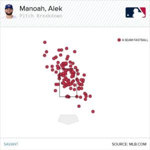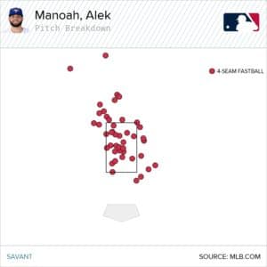 We will begin with the fastball. Manoah has thrown his fastball 42.9% of the time. He typically throws the fastball up in the zone, as he did in his first three starts…